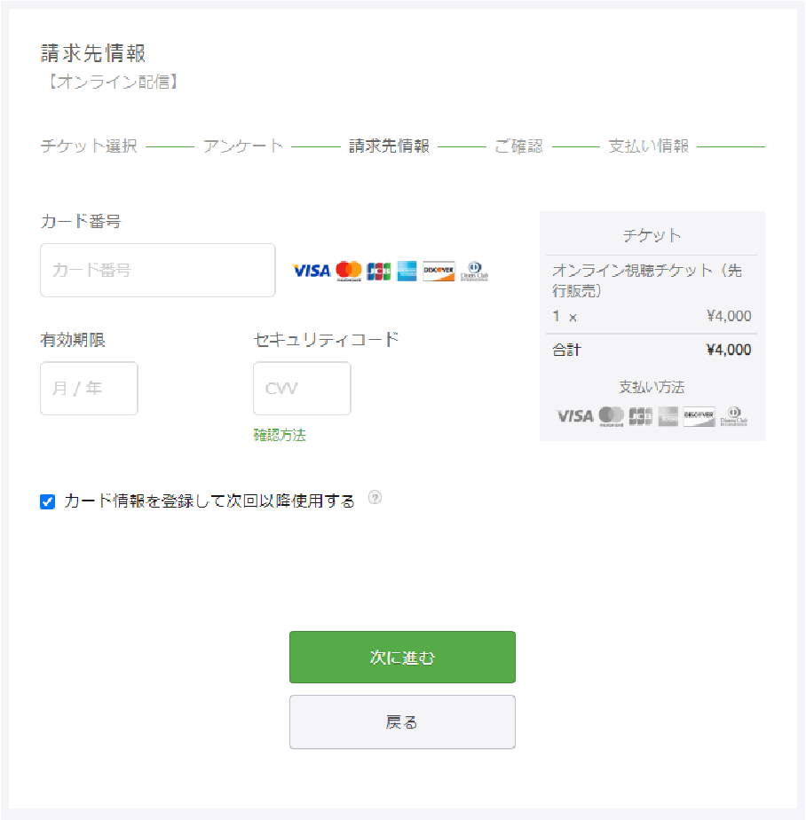 Peatixのアカウントを登録後、事前アンケートを入力して頂き、請求先情報へ進んでください。